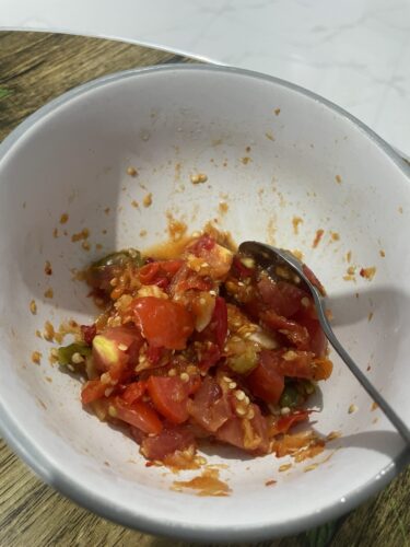 ちなみに、今回は赤い唐辛子で作ったのですが、激辛でした笑 いくらトマトを入れても辛さが引きません…