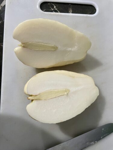 見た目は小さなカボチャだったので、次こそは中身がオレンジ色のカボチャかもと思いきや、またしても白色でした笑