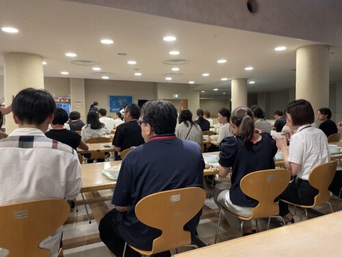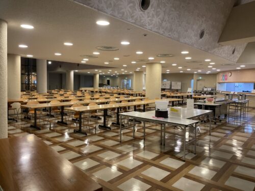 食堂はいつもにぎやかで、同じ班や語学クラスの仲間と話しながら食べてます。